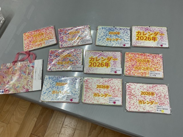 ワークスタディの紙工で作成したオリジナルカレンダーを校長室に納品に行きました。紙漉きからデザインなどたくさんの工程をみんなで丁寧に仕上げた作品です。校長先生にも喜んでいただきました。