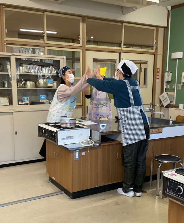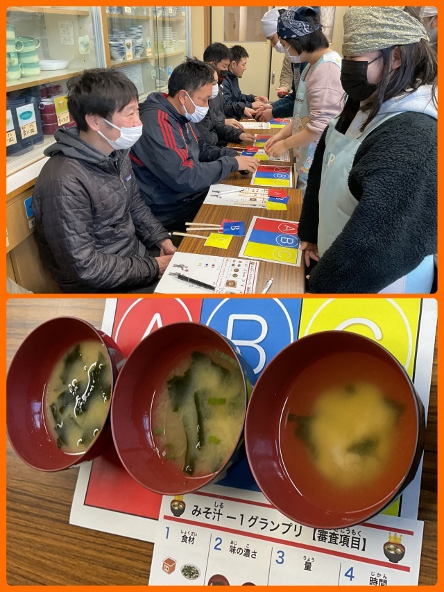 M(みそ汁)ー1グランプリが調理室で開催されました。3チームがエントリーし、それぞれが工夫をしながらみそ汁を作りました。食材、味の濃さ、量、時間などの項目が審査され、グランプリが決定しました。