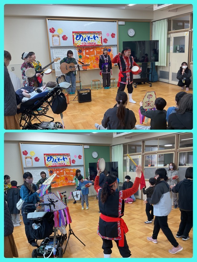 エイサー隊の皆さんの「西の宝」の歌や演奏、踊りが始まると、子どもたちはすぐに思い出したように、自然と踊りや演奏を始め、笑顔いっぱいの時間となりました。