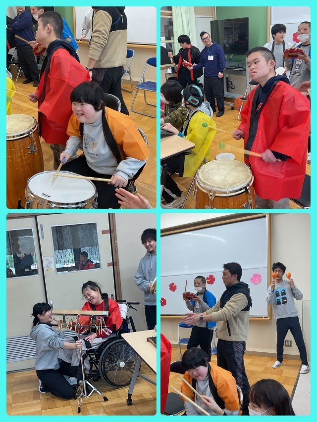 40周年記念式典にもご参加いただいたエイサー隊の皆さんをお招きし、小学部2年生と中学部3年生の児童生徒と一緒に、踊りや楽器の演奏を楽しみました。