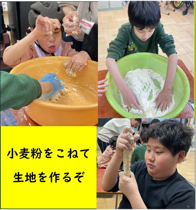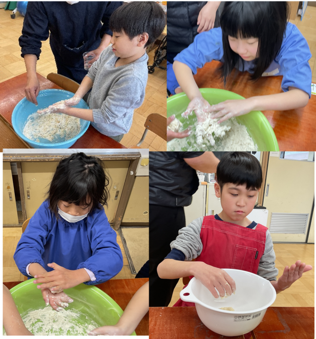 初めはさらさらとしていた小麦粉も、水を加えていくにつれて少しずつ質感が変わり、子どもたちはその変化を手のひらで確かめながら丁寧にこね進めていました。