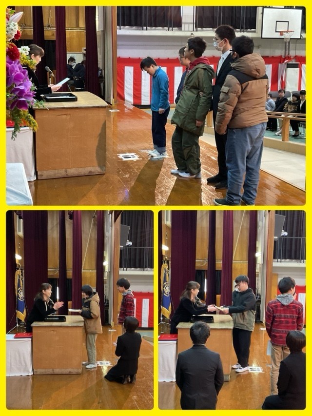 卒業証書授与式の予行の後、各種の表彰を行いました。版画展や書初め展、100冊読書マラソン、教育美術展覧会で優れた成果を収めた児童生徒に加え、1日も休まずに登校した児童生徒へ贈る「コンプリート賞」についても表彰を行いました。