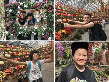 昼食後は水族館を出て「なばなの里」に行っています。アイランド富士では絶景を楽しんでいます。ベゴニア館ではお花に囲まれて美男子・美女ぶりが増していますね。