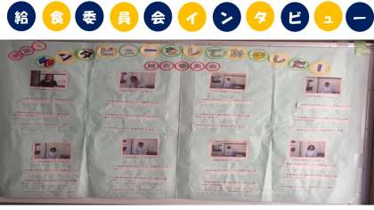 5月6月の給食委員会の活動は,「給食の先生と配膳員さんにインタビューをしにいこう」でした。インタビュー内容は,「名前・給食のおすすめメニュー・給食を出すときに心がけていること・全校のみんなに一言」でした。その内容を1枚の壁新聞にまとめ,サービスホール近くに掲示されています。配膳員さんたちも仕上がりに大満足!「これからもお仕事がんばります」と言っていました。