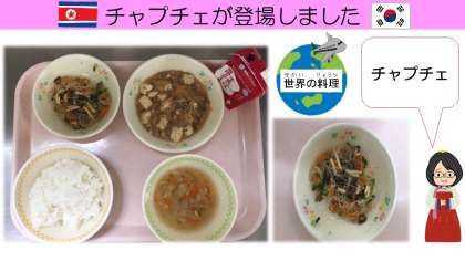 献立から,世界の食文化を知り,また日本の食文化を学べるように,世界の料理が登場します。きょうは,韓国・朝鮮の料理で,お祝いの席などでふるまわれる伝統的な料理である「チャプチェ」が登場しました。韓国・朝鮮では,さつまいもでんぷんで作られる唐麺(タンミョン)という春雨と,細切りにした牛肉や野菜を炒めて,あまからく味付けをして作ります。給食では,緑豆春雨を使用しました。にんにくがよくきいていて,つるつるっと食べられるので,おいしそうに食べていました。