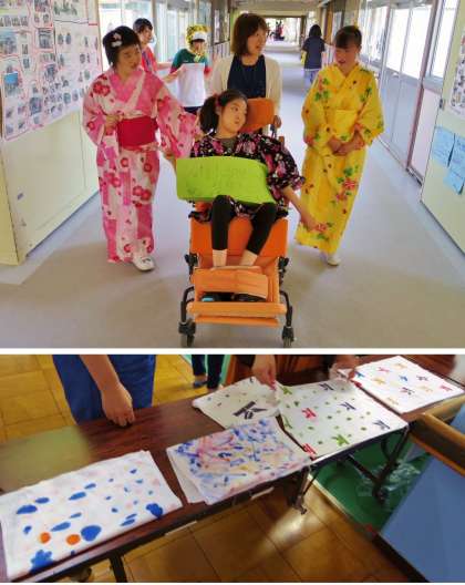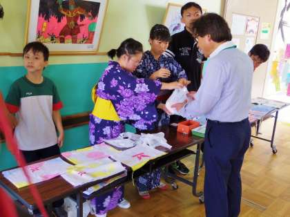本日は参観日です。高3はライフスタディで制作した手ぬぐいを販売しました。参観日で来校中の保護者の方々に向けて声をかけて回る「宣伝隊」,実際に販売をする「販売隊」と役割分担をしました。女子生徒は涼しげな浴衣を着て,歩き方や振る舞いまでおしとやかになっていました。お客さんに「浴衣,かわいいわぁ!」と声をかけられ,とても嬉しそうにしていました。販売の方は暑さに負けず絶好調で,たくさん買っていただきました。