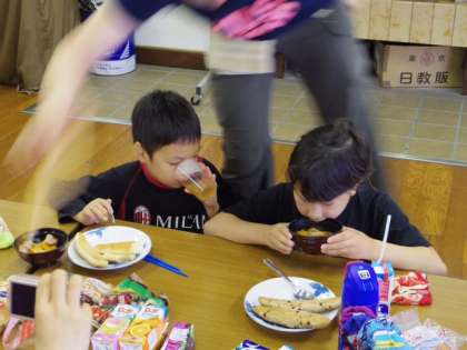 今朝の朝食の様子です。みんな元気に過ごしているようです。