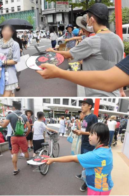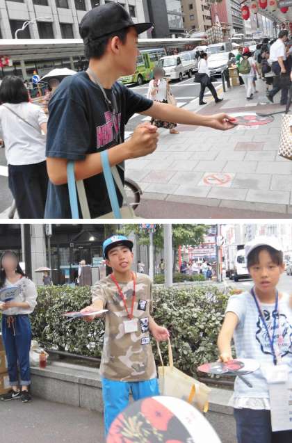 中学部から代表して6人が祇園祭のうちわ配りに行きました。みんな緊張せず,「うちわどうぞ」と声をかけながら通る人たちに配ることができました。一人あたり70枚近くを配り切りました!受け取ってもらえたり,「ありがとう」と言葉をかけてもらったりした時にはとても嬉しそうな様子でした。