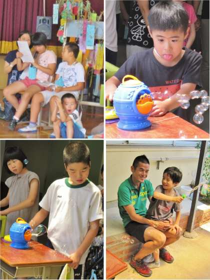 夏季休業を前に,小学部のみんなで夏の集いをしました。始めの会を児童会本部の司会進行でした後,校内の各所に設置された遊びのコーナーをスタンプラリー形式で回りました。シャボン玉遊びは,様々な仕掛けのシャボン玉があり,子どもたちは興味津々で遊んでいました。