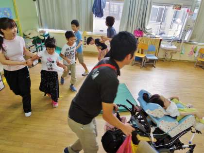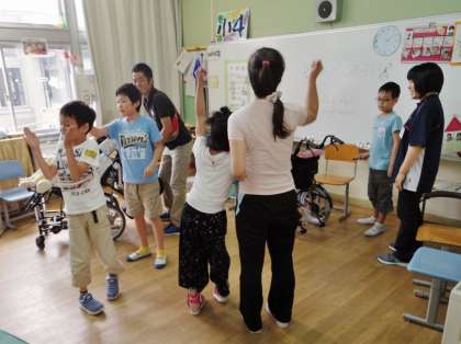小4が音楽遊びをしていました。途中でテンポが遅くなり,最後は速くなって終わる曲で,テンポに合わせてキャッキャッと言いながら教室内を回りました。自ら友達と手をつなぐ人もいて,とても楽しい空間でした。