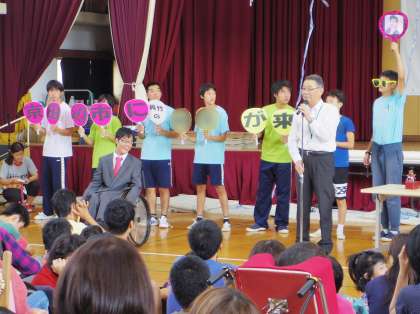 表彰の最後に,10月8日(日)に放送されたNHK「のど自慢」に出演し,記念のトロフィーを受け取った生徒の紹介がありました。校長先生からは「テレビに出て自分の強みを披露することは,絵画やスポーツで表彰されるのと同じように素晴らしいことです。」とお話がありました。せっかくなので,その歌声を披露してもらいました。同学年の友だちのウチワでの応援や全校のみんなの手拍子の中,しっかりと歌い上げてくれました。