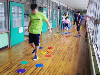 今日は,普段体育館で活動している「体育館サーキット」のユニットが廊下で活動をしていました(写真上)。学習発表会の舞台練習のため,体育館が使えないためなのですが,場所が変わっても落ち着いて活動に取り組んでいました。