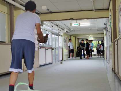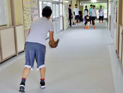「金ゴゴ」のユニットの一つ「グラウンドスポーツ」では,10/13(金)は雨天でグランドが使えなかったので,廊下で活動をしました。ゴロや短い球をキャッチする活動では,写真のように真剣に球に向かっていました。