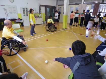 「金ゴゴ」のユニットの一つ「室内スポーツ」では,10/13(金)はボッチャをしました。今回はボッチャの指導者である三好 俊昭(みよし としあき)さんにご来校いただき,ご指導をいただきました。これは,今年度本校がスポーツ庁より指定を受けている「Specialプロジェクト2020モデル事業」を活用したものです。生徒は専門の先生からのご助言を受けて,懸命にジャックボール(目標球)と呼ばれる白いボールに向かってボールを投げていました。