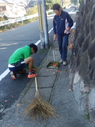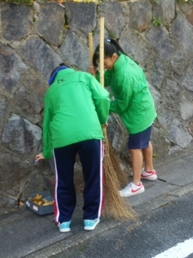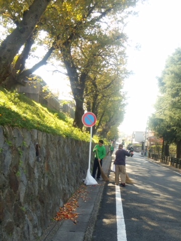 落ち葉が散り始めたこの季節,毎年恒例の秋季地域清掃活動で学校周辺の落ち葉掃除を始めました。高等部で2限にワークスタディをしている生徒が活動をしていて,“門掃き隊”と呼んでいます。生徒は懸命に活動に落ち葉を集め,きれいになった路面を見て達成感を感じていた様子でした。集めた落ち葉は校内の「落ち葉入れ」に入れて,腐葉土にしていきます。