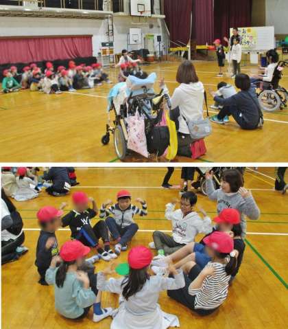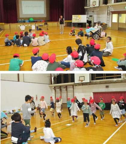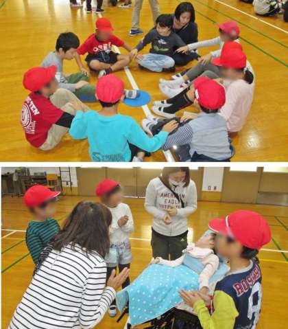 本校の小学部が従来から学校間交流(交流及び共同学習)をしている桃山小学校から,4年生の1クラスが呉竹に来てくれて,小4となかよし交流をしました。自己紹介の後,「手と手と手と」を一緒に歌ったり,「これなんでしょうかゲーム」をしたりして交流しました。最後に,桃小の4年生が運動会の踊りを披露してくれました。ふれあう中で,自然に交流し合い,笑顔がこぼれていました。