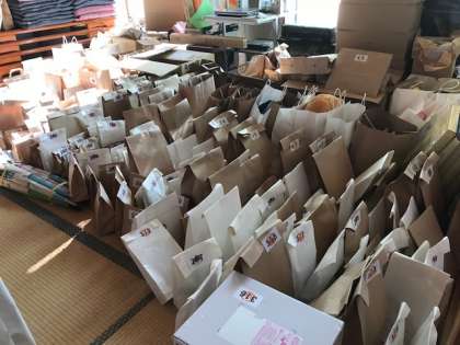 高等部の役割活動(軽作業)のユニットが,呉竹フェスタ秋のビンゴ大会の景品を準備してくれました。任された作業を着々と進め,写真のように大量の景品を準備してくれました。