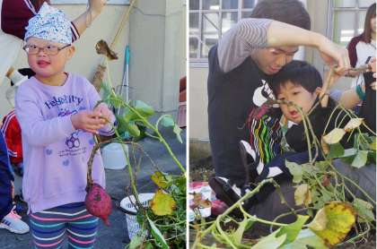 小学部1年生が学年の畑で育ててきたサツマイモを11/10(金)に収穫しました。イモのつるを「うんとこしょ!どっこいしょ!」とひっぱったり,スコップで土を掘ったりするとサツマイモが出てきました。収穫したサツマイモを嬉しそうな表情で,あるいは,不思議そうな表情でマジマジと見つめる姿が印象的でした。先生に励まされ,勇気を出して土やサツマイモを触った人もいました。