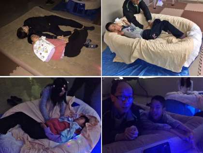 京都教育大学の大学祭でのスヌーズレン企画に参加した中学部の一部メンバーの様子です。ビニールプールはお手製のウォーターベッドになっていて,入ると不思議と落ち着く感覚がありました。