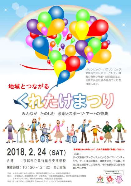 2020年(平成32年)東京オリンピック・パラリンピックのレガシーとして,障害の有無や年齢・性別を超えた地域の共生社会の拠点づくりを目指し,全国の特別支援学校で「Specialプロジェクト2020」が始動しています。本校もスポーツ庁委託事業として“みんながたのしむ余暇とスポーツ・アートの祭典「呉竹祭」”を2月24日(土)に開催します。