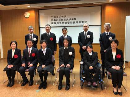 2/23(金),京都市総合教育センターで「高等部生徒資格取得等表彰式」がありました。本校からは日本漢字能力検定に合格した生徒など計3名が表彰されました。うち1名は当日は欠席でしたが,出席した2名の生徒は,緊張しながらも表彰状をしっかりと受け取り,自信に満ちた表情を浮かべていました。これからも様々な活躍を期待します。