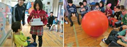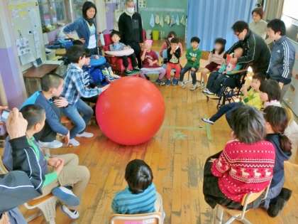 1年生とは,お誕生日を迎えた1年生のお友だちをお祝いした後,ボール回しゲームをしました。大きなボールがみんなの輪の中を転がります。音楽が止まった時に持っていた人には「こちょこちょ〜」。最後にみんなで大好きなエビカニクスを踊りました。みんなで大盛り上がりでした。