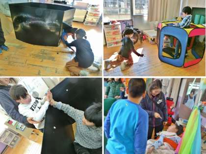 4年生とはかくれんぼをしました。見つける役とかくれる役に分かれて遊びました。大きなとんがり型の段ボールや細長い段ボール,ふわふわの布などにかくれたお友だちを「みーつけた!」。「みつかっちゃた!」では「はい,タッチ。」。自然な関わりができ,楽しい時間を過ごしました。