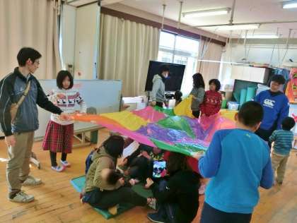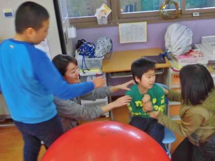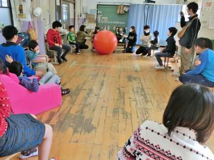 卒業前,小6と他学年との交流も最後になりました。今回は2年生です。大玉転がしゲームをした後,バルーンを持つ人と中に入る人に分かれてバルーン遊びをしました。大好きな『夢をかなえてドラえもん』の曲に合わせて歩いたり,揺らしたり。最後にみんなで笑顔いっぱいの記念写真を撮りました。