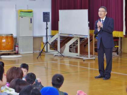 本日3/23(金),平成29年度の修了式を行いました。小6・中3・高3が不在で,いつもより体育館がゆったり使え,逆にさみしさを感じる中,まず校歌斉唱をしました。その後,校長先生のお話の中で「今年1年間,頑張った人?」と問いかけがあり,多くの子ども達が元気に手を挙げていました。校長先生からは「今日,もらう通知表の裏面に四角いハンコが押してある人は,今年度頑張ってきた人です。ハンコが押してあるかよく確認してください。」という話がありました。今年度末で転校する児童の紹介がありました。