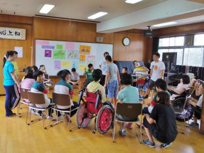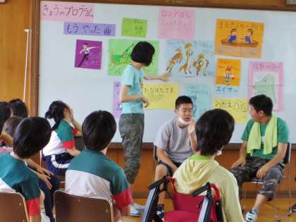 6/29(金)の金ゴゴ音楽の様子です。振り返りの場面で,今日の楽しかった活動を発表し合っています。掲示物を上手に使って「〇〇,楽しかった!」等と言うことはもちろん,発表者に注目して,その場で本人だけでなく周りの人も歌いだしたり踊り出したりして,皆で認め合っていて,とてもあたたかい雰囲気がありました。