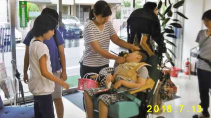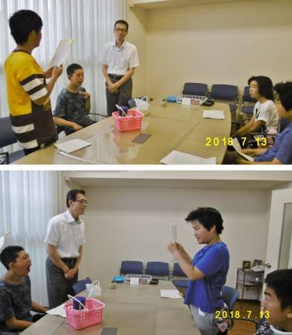 7/13(金),中学部での地域活動の一つとして「地域にこにこ配達隊」を行いました。これは,ワークスタディの製品を地域の方にお届けする活動を通して地域の方と交流することで,様々な方とのコミュニケ−ション力を高める目的で行なっているものです。今回は,京都信用金庫桃山支店へ行き,支店長様をはじめとする銀行の方々にご対応いただきました。