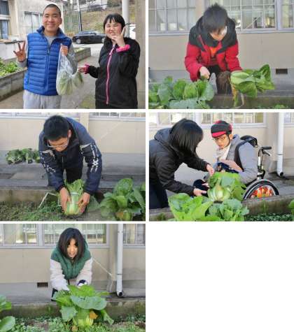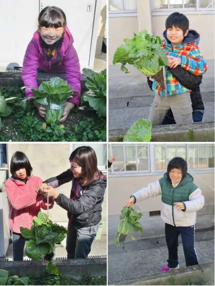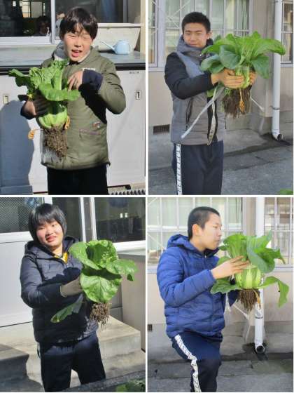 中1のみんなで種を蒔いて育ててきた白菜を収穫しました。白菜を両手で持って引っぱったり,巻いてある紐を引っぱったりして抜きました。持ち帰って家で食べた生徒から「白菜スープ作った!」「美味しかったよ!」等と嬉しい報告がたくさんありました。