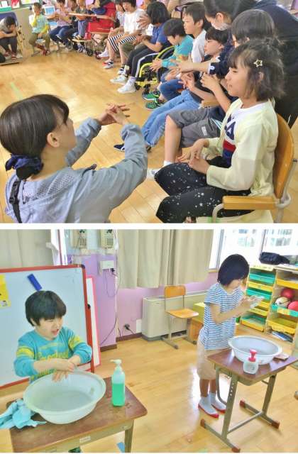 今年度,小5と小6が合同で「保健」の学習をしています。第1回目は「手洗い」の学習をしました。