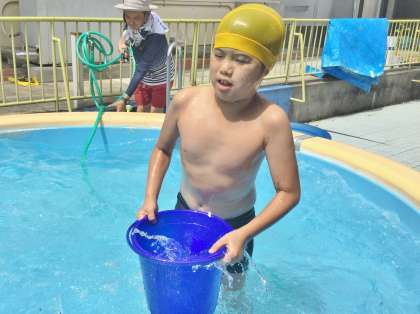 6/28(金),小4がひょうたんプールで水泳学習を行いました。モデルを見て,しっかり準備運動をした後,入水。バケツを使って友だちに水をかけたり,友だちから水をかけられたりして大笑いする様子が見られました。