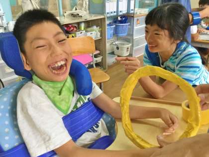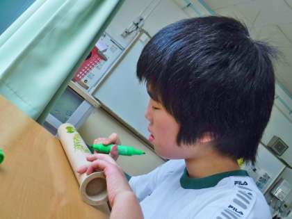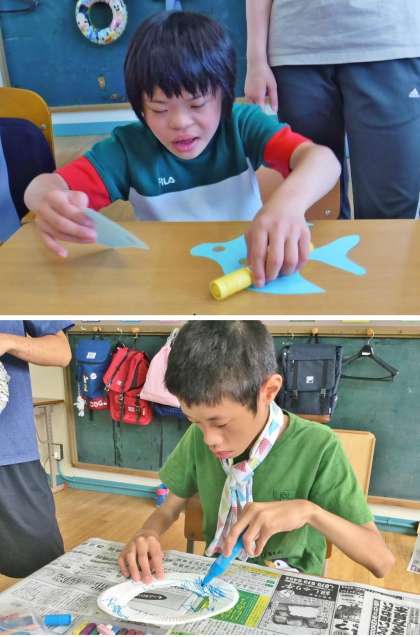 中学部1年生は今,7/23(火)に実施する中学部「夏のつどい」で使うグッズを作成中です。輪投げの的をマジックやシールでデコレーションをしたり,魚釣りの魚を描いたり,友だちの顔写真を貼って得点表を作ったり,みんな大忙し!夏のつどいがより楽しくなるように,みんな頑張っています。