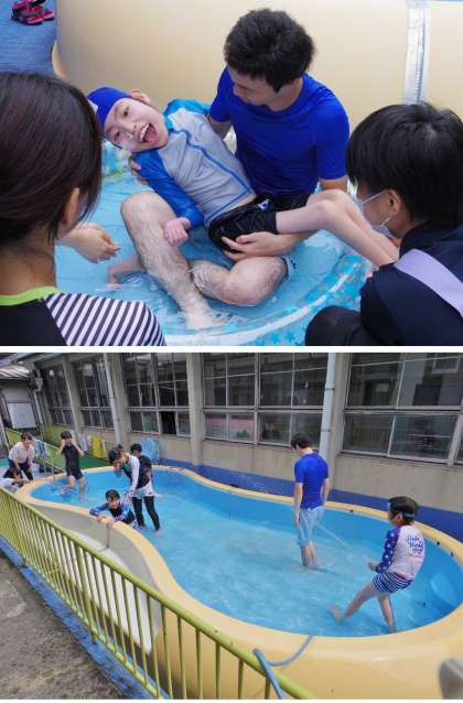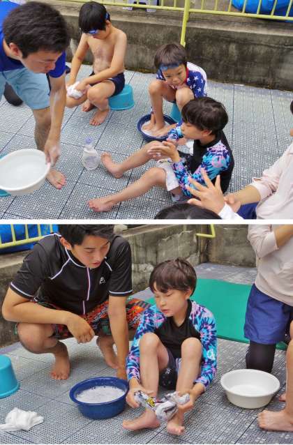 小6は9月に修学旅行を控えています。修学旅行でのお風呂の事前学習を兼ねて,ひょうたんプールに入水する前に身体を洗う活動をしました。タオルを水で濡らしてボディソープをつけてなじませ,身体を洗います。家でのお風呂の様子を思い出して「こんな風にするんだよ!」と意気揚々と取り組んでいました。さっぱりした後は,思い切りひょうたんプールでの活動を楽しみました!