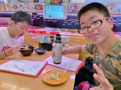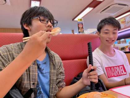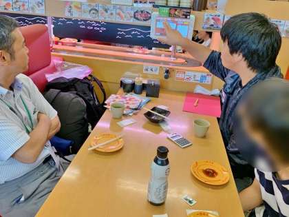 往路5グループの昼食は回転寿司です。予算とにらめっこしながら好きなものを頼んでいます。あるテーブルはえび三昧など,生徒の好きな物が丸わかりで面白いです。