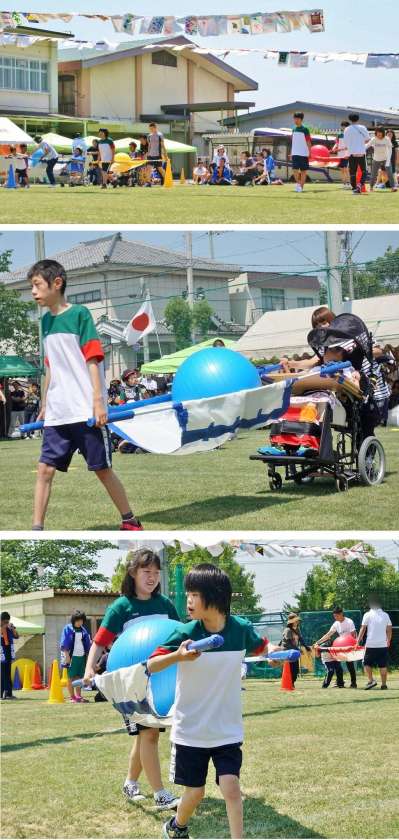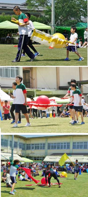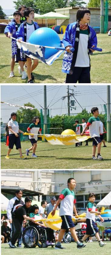 体育の部の中学部種目「大玉わっしょい!」の様子です。大玉を「みこし」に担いでリレーしていきます。学年の生徒に応じた工夫がされたみこしで,自分たちのペースで大玉をつないでいました。