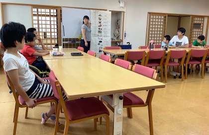 朝食の前に朝の会で予定確認です。「何号バスで帰るのかな?」「2!」と事前学習をしっかりと覚えていました。