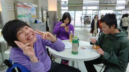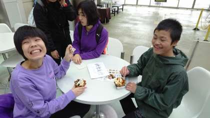 A班は待合室で軽食をとりながら水上バスを待っています。