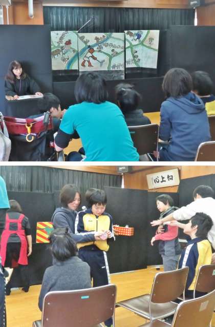 12/10(火),中学部「地域生活・家庭生活Bユニット」では,嵯峨小PTA絵本の会の方々をお招きして,人形劇鑑賞をしました。演目は「ちからたろう」。生徒は,ちからたろうが天井に届きそうに大きくなる演出や音楽に合わせて進むお話にくぎづけでした。最後は自分たちが制作したリースをお礼のプレゼントとしてお渡ししました。
