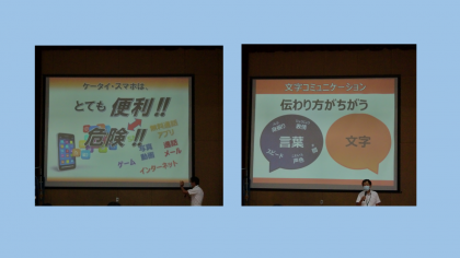 高等部では,携帯を使う際のルールやマナーについての学習会を行いました。外部より講師を招き,対面と文字だけのコミュニケーションの伝わり方の違いや,携帯は便利だけれども使い方をあやまるととても危険であることを学びました。実際に起こった事例のアニメを見て,どうすればよかったか等を,考えて発表する生徒もいました。