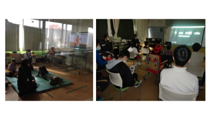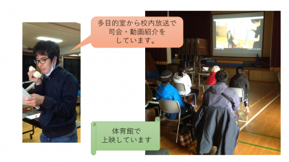 各学部・学年の児童生徒は,発表動画を椅子に座ったり,床に座ったり,それぞれのスタイルで鑑賞していました。