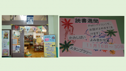 11月16日(月)〜30日(月)まで読書週間を行います。スタンプラリーや読み聞かせ,iPadでお話を読んだり聞いたりできるなど,様々な企画をしています。この機会にたくさん本に触れる経験をしてほしいと思います。