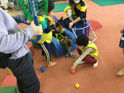 小学部1年生は来週行われる小学部のスポーツフェスティバルに向けて,運動遊びで玉入れをしました。2チームに分かれて,自分のチームのかごに玉をたくさん入れることができました。