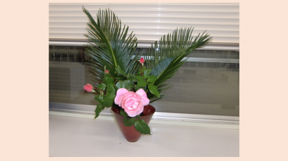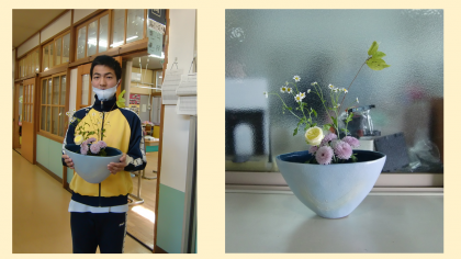 高等部3年生徒2名が花を生けました。玄関と校長室に置いてあります。教職員やバスの乗務員さんから「お花があるといいね。」「きれいだね。」等の声が聞こえています。