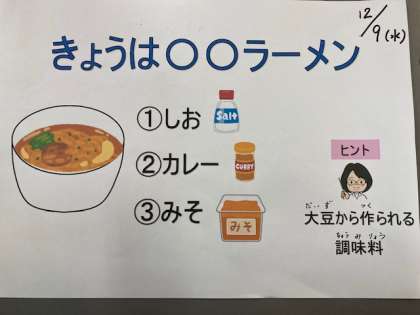今日のクイズも「ラーメン」からでした。子どもたちは,この日をとても楽しみにしていました。こたえは3:みそです。