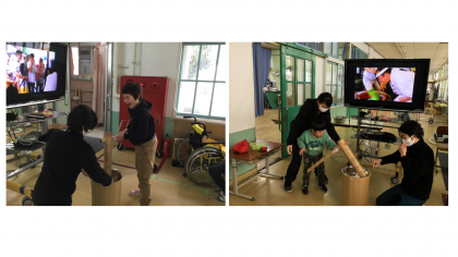 小学部3年生では,誕生日の友だちがいる月に誕生日会をしています。主役の登場の後,ケーキの飾りつけ,みんなで『おめでとう』を伝えて,その月にちなんだ遊びやみんなが好きな遊びをしています。今月は,もちつき大会と凧あげをしました。