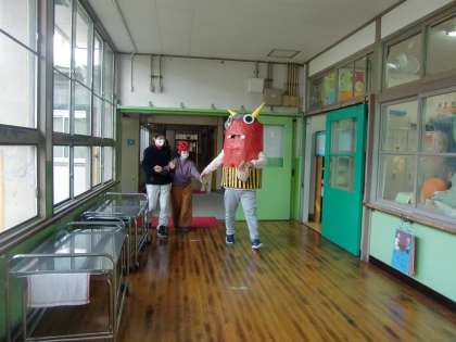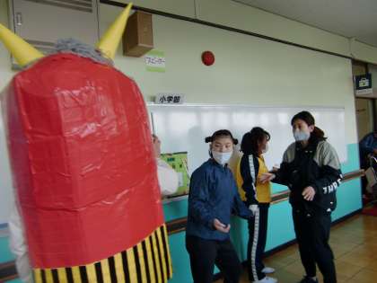 2月2日の節分に鬼が出没しました。この鬼はみんなと仲良く握手をしたり,一緒に歩いたりしていました。自分から近寄る生徒もいれば,ちょっと怖いかも・・・という表情をしている生徒もいました。