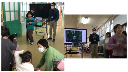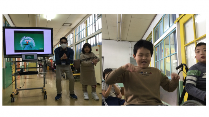 今回は,たくさんの英語の歌を聞き,ダンスを踊りました。日本語で慣れ親しんでいる,手遊び歌『グーチョキパー』や『しあわせなら手を叩こう』『さんぽ』『BINGO』,そして大好きな『パプリカ』のダンスでは,1年生も一緒に楽しく踊りながら英語に親しみました。終わりのあいさつの後は,ジェラード先生に「See you!!」と手を振っていました。